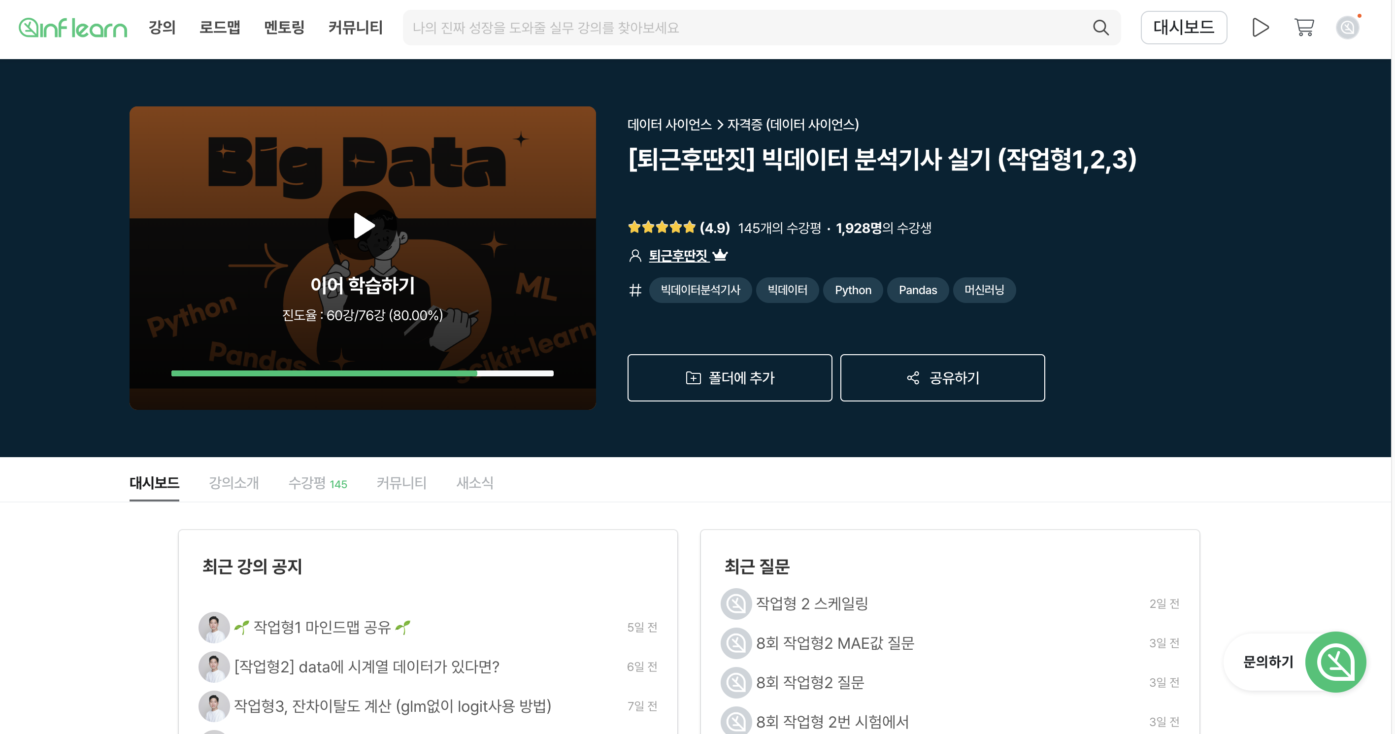 처음엔 데이터포럼 카페에서 이전 시험 후기를 찾아보니 많은 분들이 교재보다는 인강을 선택하고, 직접 코딩을 따라 해보는 게 중요하다고 해서 강의를 듣기로 했다.