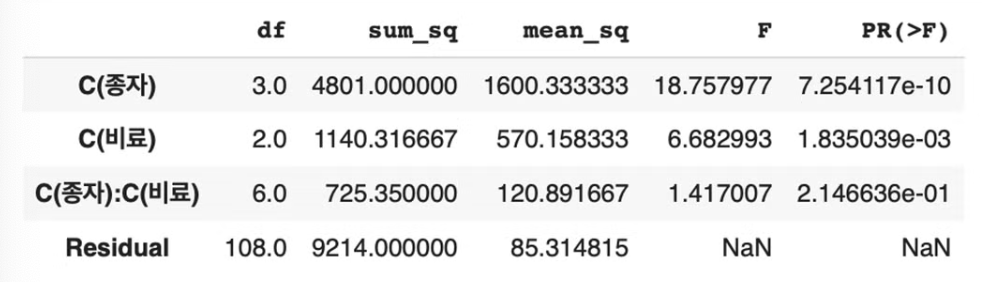 model = ols('종속변수 ~ C(요인1) * C(요인2)', data=df).fit()